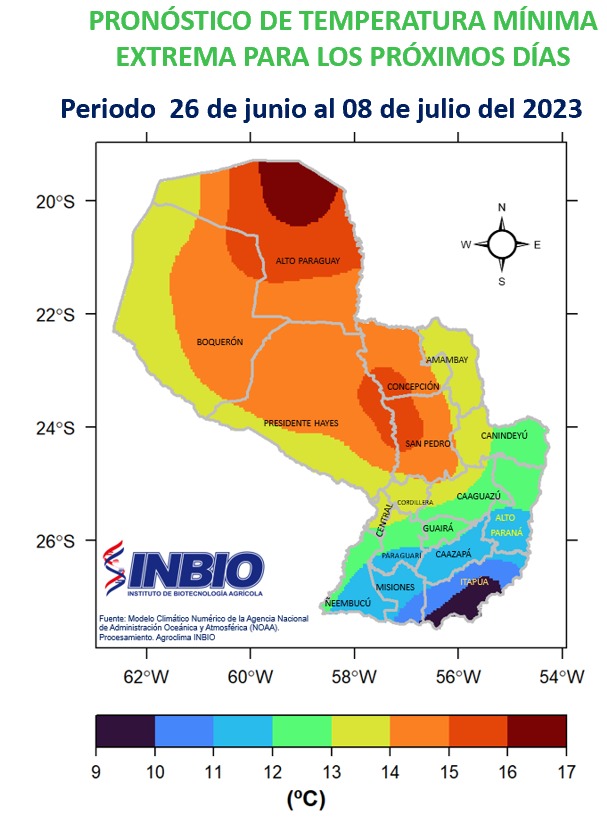 De acuerdo con el Inbio, entre el 26 y el 8 de julio se registrarían mínimas extremas. Concretamente, una franja del sur de la región Oriental sería la zona con temperaturas más bajas, donde los registros estarían entre 10 °C y 9 °C en una superficie considerable de Itapúa y una pequeña área de Misiones.