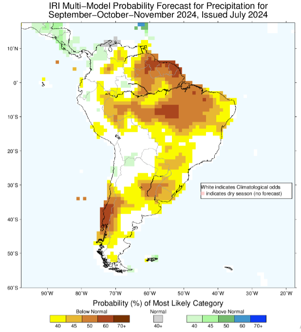 Los indicadores muestran que lo más probable es que El Niño esté por debajo del umbral de La Niña durante cuatro estaciones superpuestas, desde septiembre-noviembre del 2024 hasta diciembre del 2024-febrero del 2025. En los reportes más recientes, el equipo de pronosticadores observan probabilidades casi iguales para ENSO-neutral y La Niña en agosto-octubre de este año, con probabilidades más altas para La Niña en septiembre-noviembre.