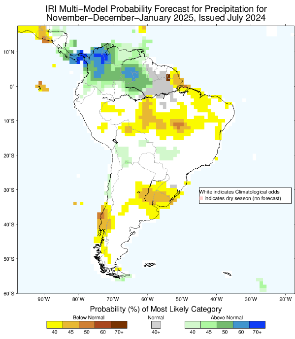 Desde la Unidad de Gestión de Riesgos (UGP), del Ministerio de Agricultura y Ganadería (MAG), se emitió un informe sobre el estado del sistema de alerta de El Niño/Oscilación del Sur (ENSO, por sus siglas en inglés). El reporte señala que se espera que continúen las condiciones de ENSO-neutral durante los próximos meses, lo que favorece la emergencia de La Niña entre septiembre y noviembre, con 66 % de probabilidad, y persiste durante el verano del hemisferio Sur 2024-2025, con el 74 % de probabilidad.