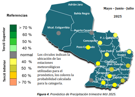 Con respecto a las perspectivas climáticas para Paraguay, que abarca los meses de mayo, junio y julio, el pronóstico de precipitación señala condiciones normales de lluvias sobre el centro y norte de la región Occidental. Así también, para el extremo suroeste de la región Oriental. Para el resto del territorio nacional, en este trimestre, se prevén acumulados por debajo de lo normal.