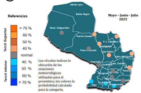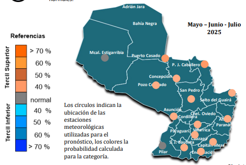 Las últimas proyecciones climáticas para el invierno en el hemisferio sur, para mayo, junio y julio, traen informaciones importantes sobre lo que se puede esperar del clima en Paraguay. En primer lugar, indican una alta probabilidad de condiciones neutrales del fenómeno ENSO (El Niño- Oscilación Sur), descartando en gran medida la presencia de El Niño o La Niña. Sin embargo, esto no significa que las condiciones climáticas sean completamente normales, ya que para varias zonas del país se esperan lluvias por debajo del promedio y temperaturas más altas de lo habitual, especialmente en la región Oriental.