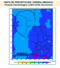 Según el pronóstico de precipitación acumulada para noviembre, desde el Inbio prevén una distribución espacial heterogéneas en el territorio paraguayo. En general, se esperan lluvias variables, con foco positivo en el norte del país.