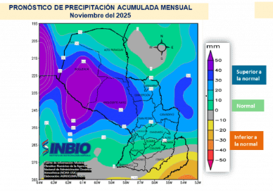 El boletín técnico agroclimático del Instituto de Biotecnología Agrícola (Inbio) presenta un panorama alentador para gran parte del territorio nacional, con proyecciones de lluvias superiores a lo normal en zonas productivas clave y condiciones de humedad del suelo mayormente adecuadas para los cultivos en curso.